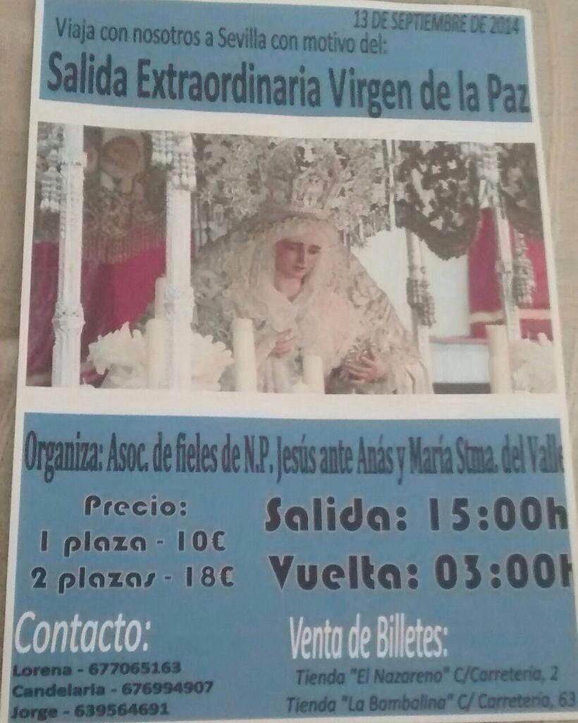 Por su parte, la asociación de Jesús ante Anás organiza una excursión a Sevilla con motivo de la salida extraordinaria de la Virgen de la Paz de dicha provincia. Será el 13 de Septiembre, y podeis elegir entre un billete por 10 euros o la oferta de dos por 18 euros. Los teléfonos de contacto y los lugares donde podeis haceros con los billetes los teneis también el cartel de la derecha.